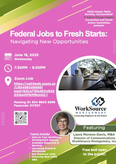 Our featured speaker will be Laura Moreno-Davis (a member of Alpha Kappa Alpha Sorority, Inc., Iota Lambda Omega Chapter). She is the Communications Director for WorkSource Montgomery, which is the County's workforce development corporation.